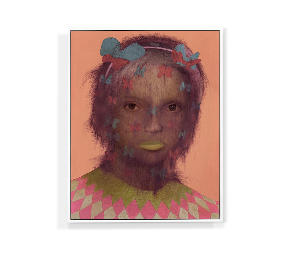 Girl with Diamond Sweater and Bows, 20" x 16" x 1 3/4" inches, oil, acrylic, and resin on panel, 2013
