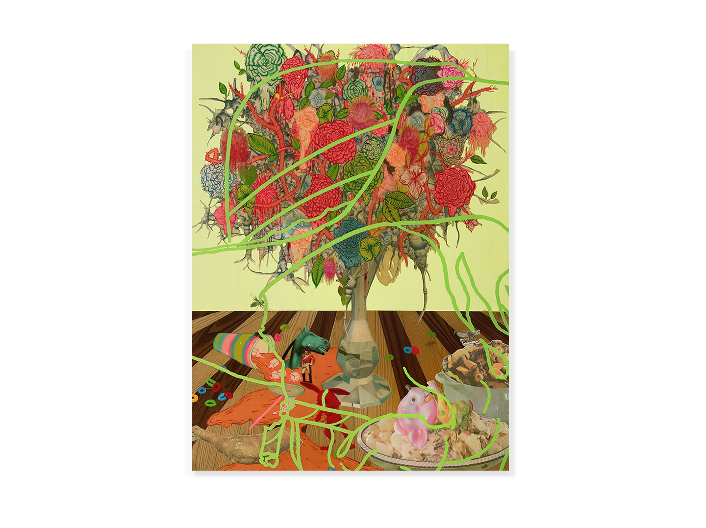 Bouquet with Casserole and Orange Drink, 48" x 33" x 1 3/4" inches, oil, acrylic, paper, ink, cyanotype, and resin on panel, 2009