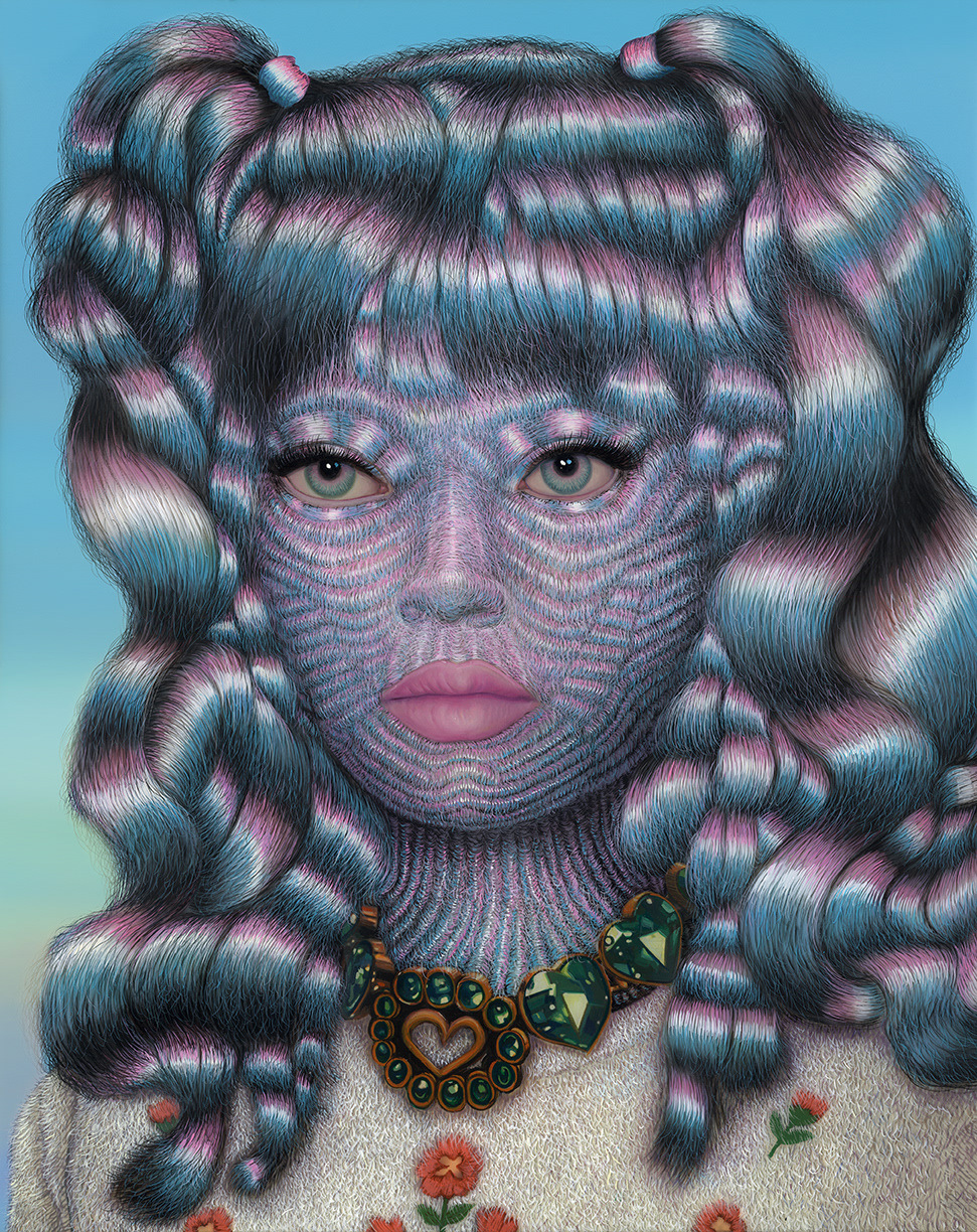 Girl with Floral Sweater and Necklace, 20 x 16 x 1.5 in (50.8 x 40.6 x 3.81 cm), oil, acrylic, and epoxy resin on panel, 2022.