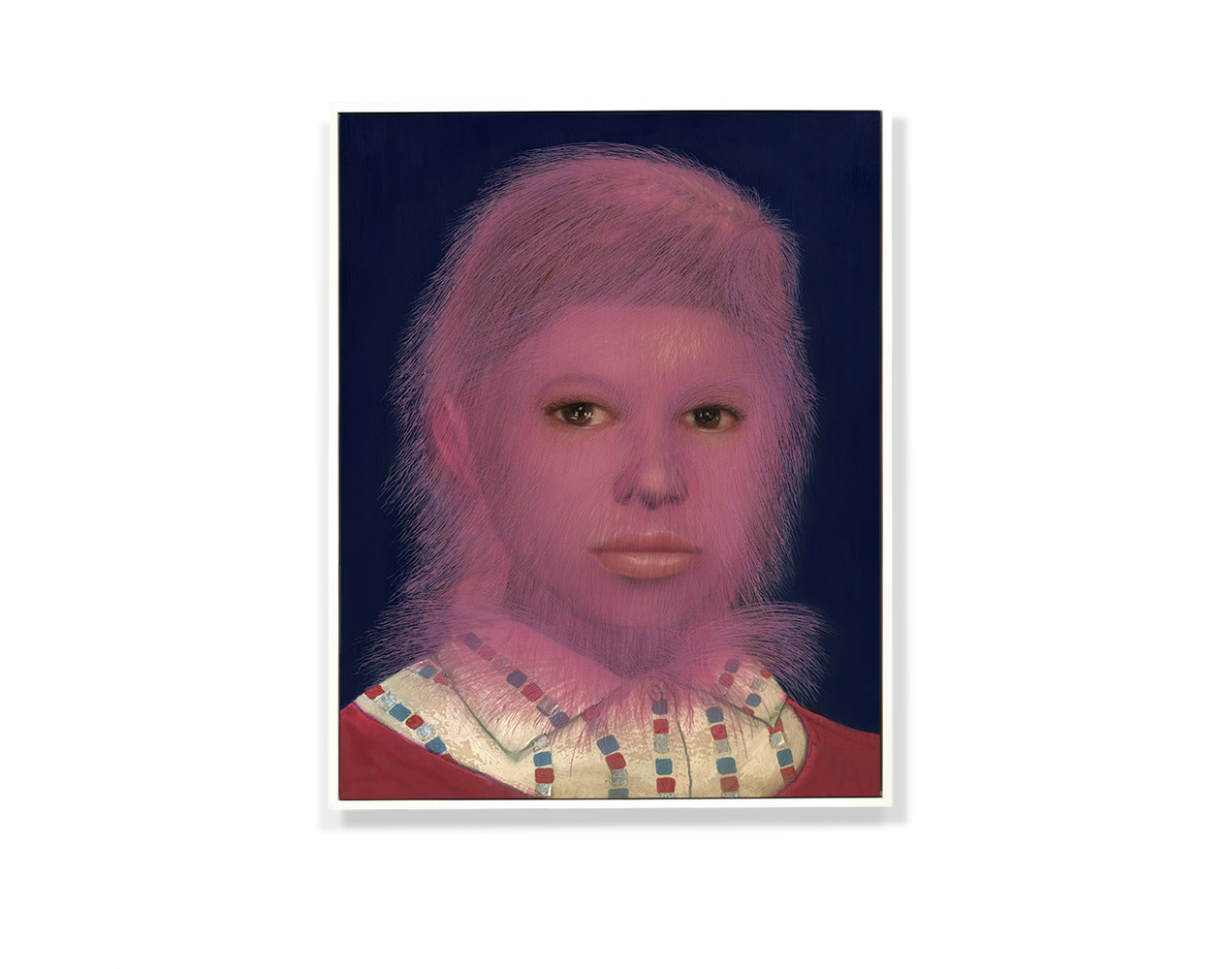 Girl with Magenta Sweater, 20" x 16" x 1 3/4" inches, oil, acrylic, paper, and resin on panel, 2009